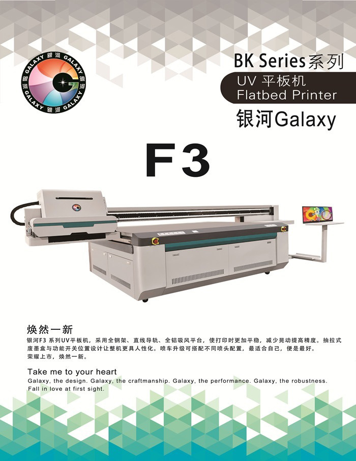 銀河F3系列UV平板機,采用全鋼架、直線導軌、全鋁吸風平臺,使打印時更加平穩,減少晃動提高精度。抽拉式廢墨盒與功能開關位置設計讓整機更具人性化。噴車升級可搭配不同噴頭配置,最適合自己,便是最好。 榮耀上市,煥然一新。
